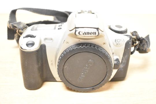 Three Canon SLR cameras, a Canon EOS 300D digital camera, a Canon EOS 300 35mm film camera, and a Canon EOS 300X 35mm film camera.
