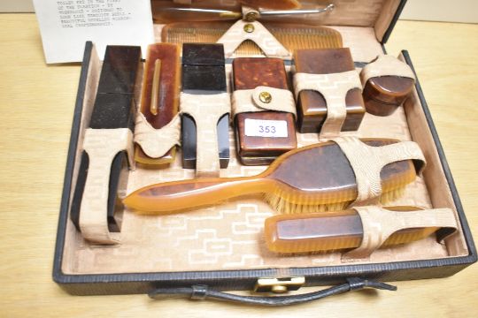 An early 20th-century American The Tuskeloid Company Gentleman's Celluloid travel vanity set, to include a hand mirror, hair brushes, combs, small containers for toiletries and more, secured within a fitted leather case, unmarked, (14 items and 1 case), condition is consistent with age and use. Celluloid is a type of early plastic often referred to as 'French Ivory', often replicating tortoiseshell.