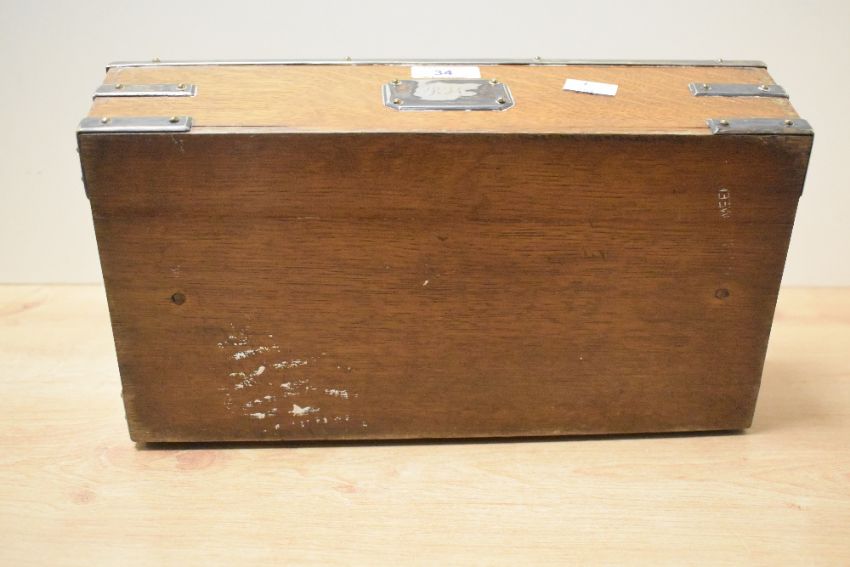 A Victorian oak cutlery caddy with metal hardware, having an initialled front plaque reading ‘KH’ in scriptural font, with reinforced metal fittings, unmarked, 35cm, condition is consistent with age and use.