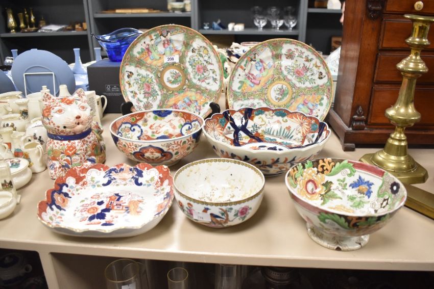 A quantity of 19th to 20th-century Oriental ceramic ware, to include a selection of Chinese porcelain featuring a decorative sitting cat of floral and foliate decoration, a small footed bowl featuring hand painted Chinoiserie floral decoration and a pair of Chinese Rose Medallion porcelain plates of Famille Rose decoration; sold with three Japanese Imari-style porcelain serving bowls/plates, some marked to base but not all, (8 pieces), condition consistent with age and use, visible surface wear.
