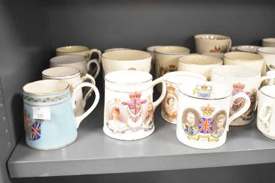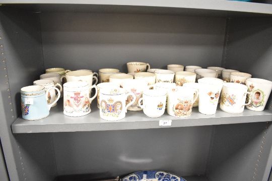 A large collection of late 19th to early 20th-century china, porcelain and ceramic Royal Commemorative cups and mugs, featuring monarchs such as George V, Queen Victoria, Queen Elizabeth and others, many marked to the base including Shelley, Fentons and C.W.S. Longtons, (approximately 37), condition is consistent with age and use.
