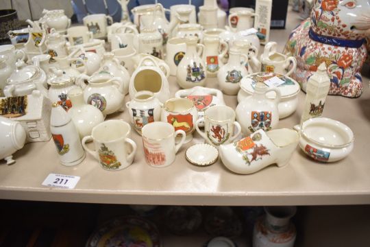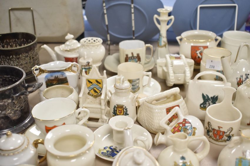 A large quantity of 20th-century miniature crested china ornaments, to include a selection of items decorated with the coat of arms or heraldic symbol representing the town or place where they were bought, to include teapots, salt pigs, trinket boxes, bells and much more, many marked to base but not all, (approximately 75 pieces), condition is consistent with age and use.