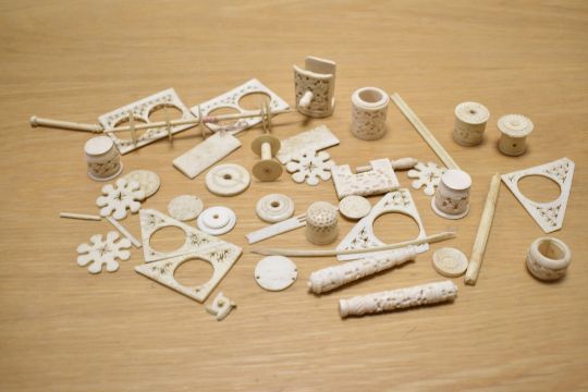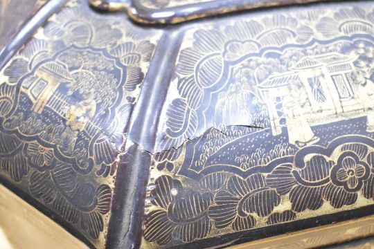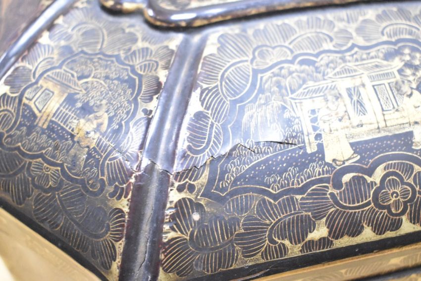 A 19th-century Chinese black and gilded lacquer sewing box, of octagonal form with a rolled top and twin metal side handles, decorated with traditional scenes of floral and figural decoration, featuring a hinged lid that reveals a section of compartments, beneath this there is a drawer of further compartments, accompanied by hand carved animal bone sewing notions, 25cm x 34cm. Condition is consistent with age and use. There is damage to the inside compartments; all pieces appear to be present, but some have come loose. No key is included. The exterior shows surface wear, including chips, scratches, and areas of broken lacquer. Of the four original feet, only three remain, and the remaining ones are damaged.