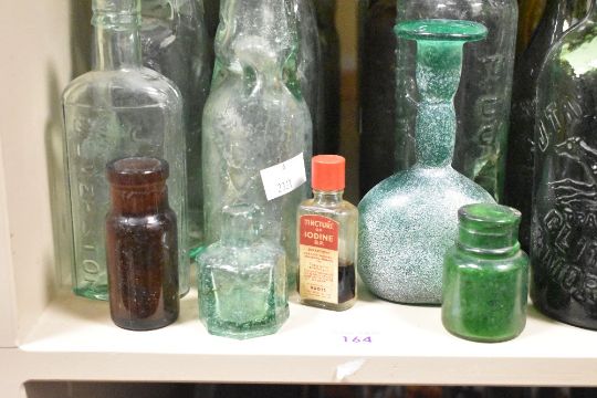 A quantity of late 19th to early 20th-century glassware, to include Codd-neck, medicinal, alcoholic bottle examples of green, blue, clear and amber variations, some with their original stoppers or liquid still inside of them, (approximately 24), condition is consistent with age and use, visible areas of surface wear and visible chips or cracks.