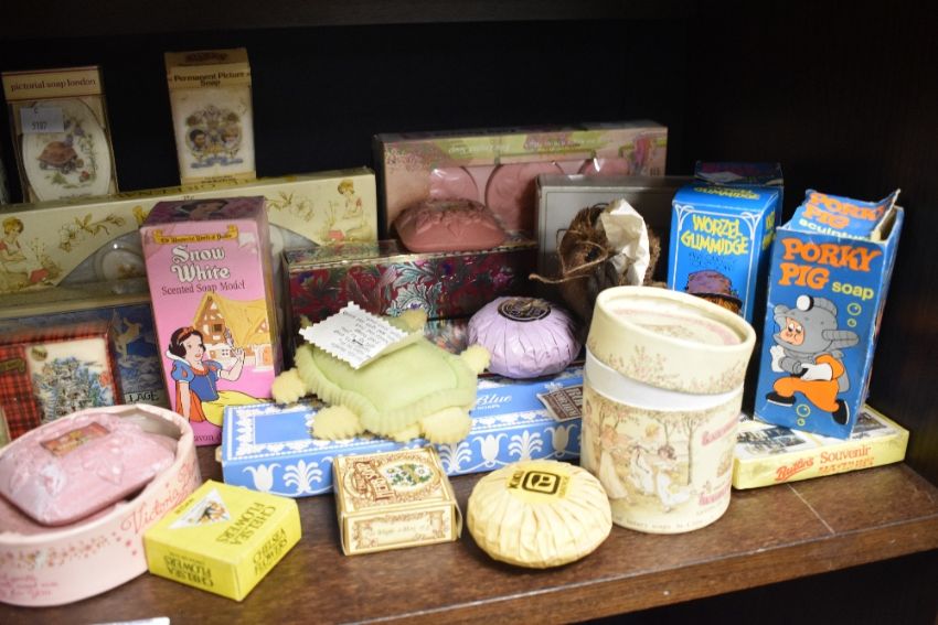 A collection of 20th-century soaps of varying designs, decorations and sculptures, to include soaps from Avon, St Michael, Cliro Perfumeries, Warner Bros, Crabtree & Evelyn, Cussons and more, most include original packaging or boxes, are unopened and unused (36).