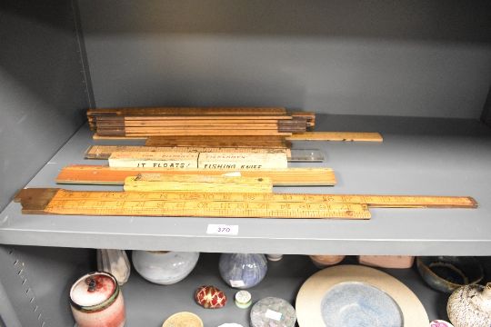A quantity of 20th-century wooden rulers, to include a Fishermans Rule with an 'honest' and 'dishonest' scale, with a serrated knife and bottle opener inside; a wood Rabone Chesterman 1641 having 2m full extension; a Drivers Rule Works of Manchester right-angle limit and others; sold with one clear plastic Gestetner exmaple, some marked to ruler, (eleven in total), condition is consistent with age and use, signs of surface wear.