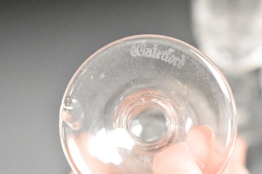 A quantity of 20th-century Irish Waterford crystal Colleen port wine glasses, featuring a diamond cut bowl with an oval 'olive' pattern towards the rim and a short stem with a faceted octagonal knob detailing above a clear rounded base, 8.5cm, (9), condition is consistent with age and use, no visible chips.