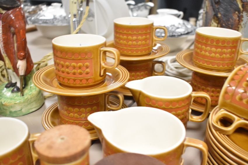 A quantity of late 20th-century Hornsea Pottery 'Saffron' part dinner and tea ware, featuring a warm amber geometric floral pattern, to include cups, saucers, milk jugs, sugar pots and more, all marked to base, (approximately 37 pieces), condition is consistent with age and use.