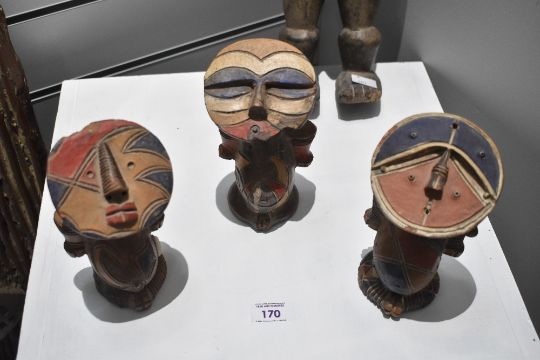 Three small 20th-century African Tribal Art terracotta fertility statuettes, presumed to originate from West Africa and possibly associated with the Bobo or Baoulé cultures, each displaying circular facial forms and primary-coloured geometric painted decoration, (3), condition is consistent with age and use, visible areas of chips and surface wear to edges of faces. The Bobo people, living primarily in western Burkina Faso and parts of Mali, are known for a rich masking tradition tied to agricultural and spiritual ceremonies. Their art often emphasises bold geometric forms, circular or mask-like faces, and strong symbolic colours. Bobo sculptures and terracotta figures are commonly linked to fertility, protection, and ancestral veneration. Ritual objects are typically used during ceremonies intended to maintain harmony between humans, nature, and the spirit world. The Baoulé, one of the largest Akan-related groups in Côte d’Ivoire, are renowned for refined and naturalistic sculpture. Their figures often represent blolo (spirit spouses), ancestors, or protective beings, reflecting a deeply rooted belief in the interaction between the physical and spiritual realms. Baoulé terracotta and wood carvings frequently feature rounded faces, delicate proportions, and balanced geometric patterning. Artworks are used for divination, personal protection, and fertility-related rituals.