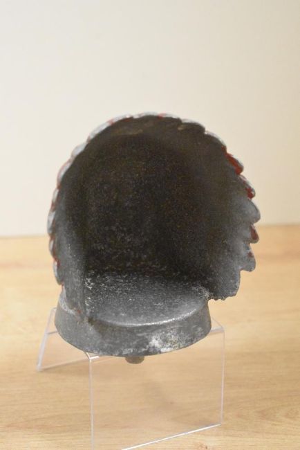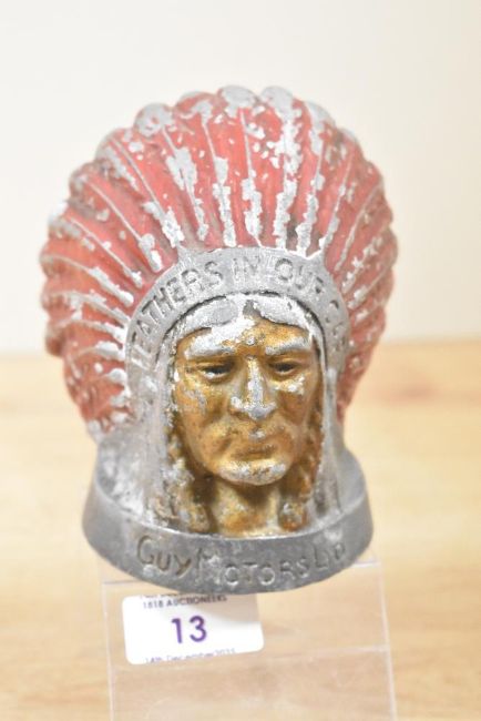 A 20th-century painted and cast metal Guy Motors Native American head car mascot, marked to front, 14cm, condition is consistent with use, overall surface wear to paint.