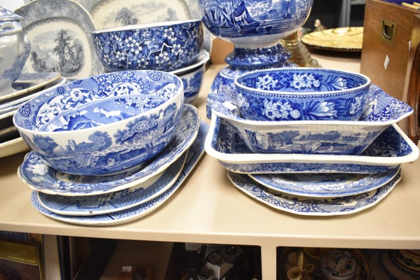 A large quantity of 19th to early 20th-century blue and white tableware, featuring Copeland Spode 'Italian', Wedgewood 'Ferrara' and 'Fallow Deer', William Brownfield and Son 'Palmyra', Minton 'Willow' and more, to include a tureen, bowls, large serving platters, smaller serving plates and trays, most marked to base, (approximately 23 pieces), condition is consistent with age and use, visible chips and cracks to some pieces and fixed visible damage visible.