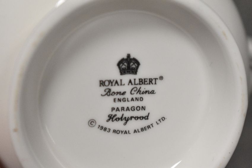 A 1983 Royal Albert bone china Paragon 'Holyrood' tea and dinnerware set, featuring a rich burgundy band decoration with a gold-coloured accented rim, marked to the base (approximately 34 pieces).