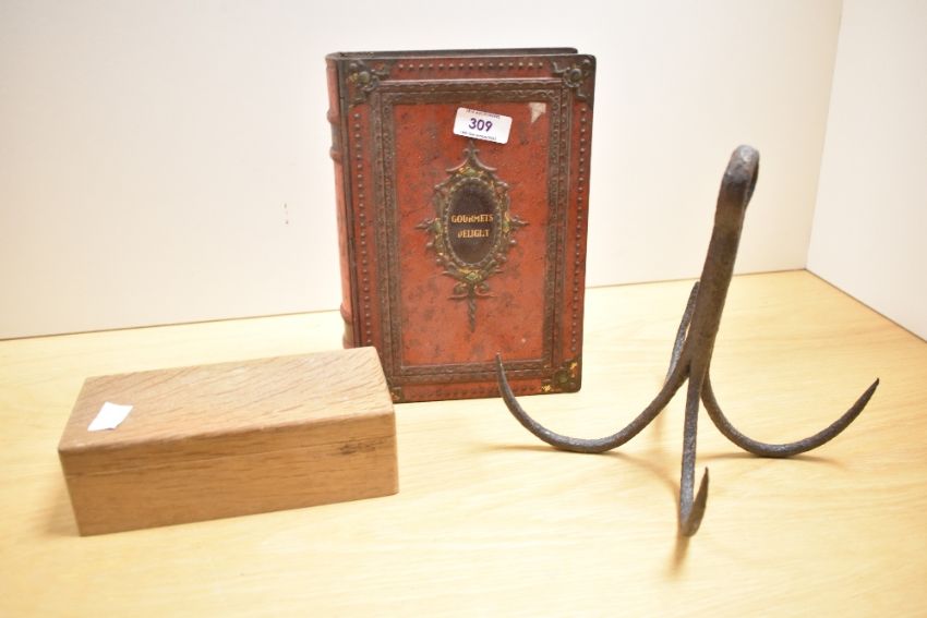 An early 20th-century hand-forged iron grappling hook; sold with a Victoria Holland Gourmet Delight metal tin in the shape of a book, (2), condition is consistent with age and use.