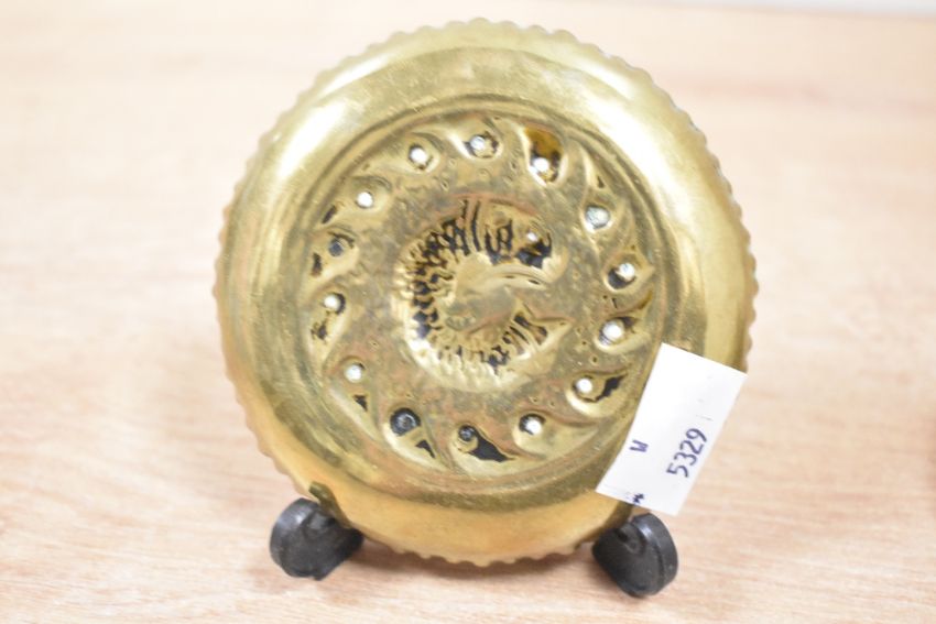 An early 20th-century Keswick School of Industrial Art (KSIA) Arts and Crafts brass dish, of circular form, a scalloped edge, and an embossed central fish is surrounded by wave-like designs suggestive of the sea, marked to front, 9cm; sold with a charming Art Nouveau-style ornate brass hinged lid stamp box, featuring a small cat perched upon the lid, 5.5cm, (2).
