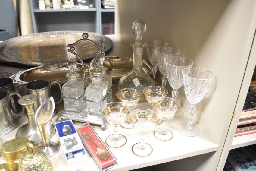 A large quantity of late 19th to 20th-century silver plate, pewter, white metal, glass and brass ware, to include serving platters, cruet set with cut-glass bottles, three small pewter tankards, tea spoons, wine glasses and more, (approximately 38 pieces), condition is consistent with age and use, tarnish to most metal and silver plate ware.
