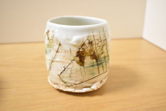 Two contemporary Jack Doherty (born 1948) porcelain yunomi covered in soda vapour glaze with incised decorations; sold with a Chris Cox ceramic tea bowl featuring an abstract organic-like decoration, all marked to base, (3), condition is consistent with age and use.