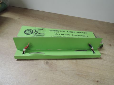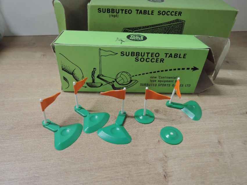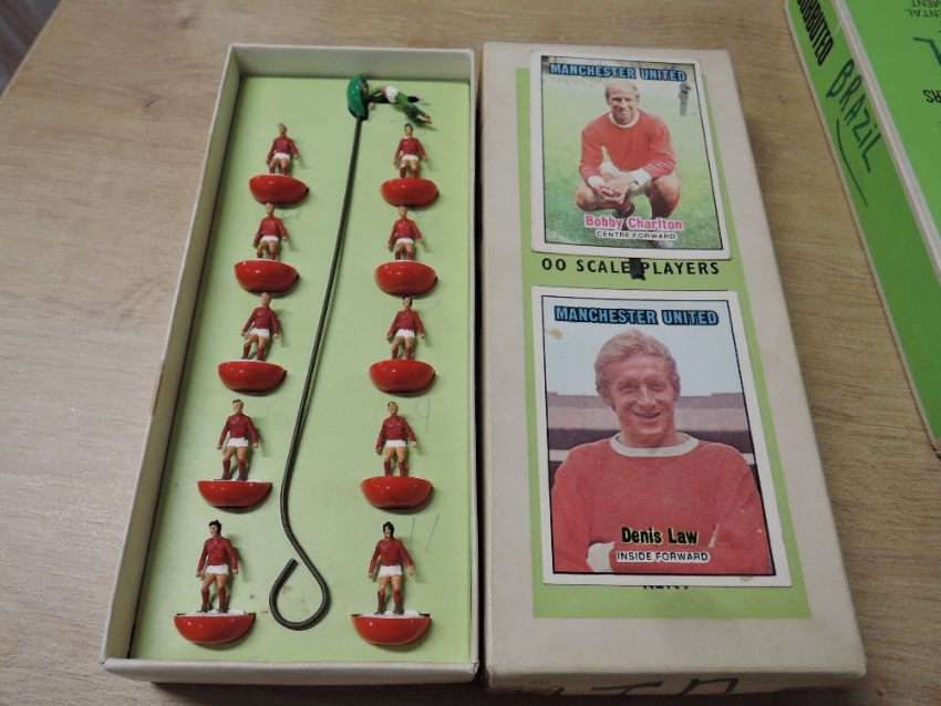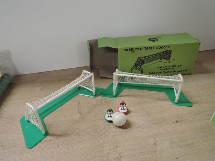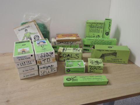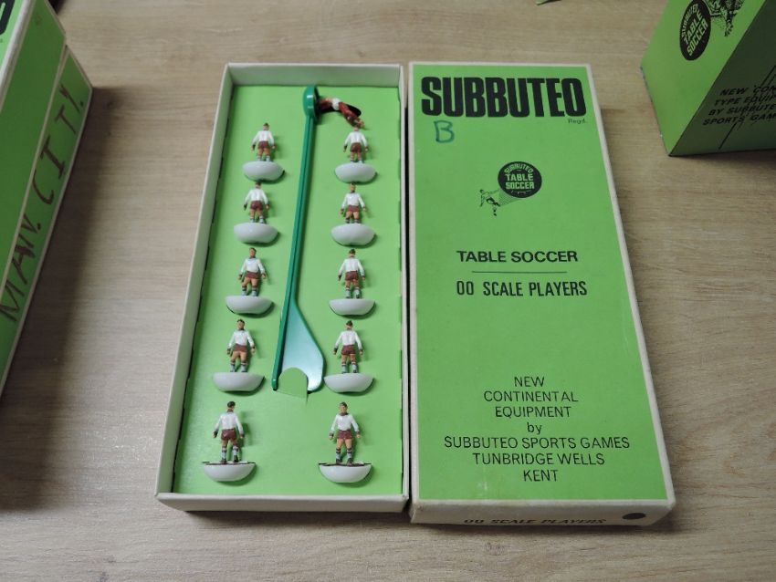 Subbuteo, 13 Teams with hand written names and stickers to original boxes, West Ham/Burnley, Brazil, Chelsea, Everton/Ipswich, Bradford, Coventry, Manchester United, Leeds, Celtic, Spurs, Manchester City, unnamed, all complete with repairs, Wolves missing goalkeeper, C122 New Type Goals, C132 Throw in Figures x2, C117 Flags Set, missing one half way line flag, bases present, Set Z Match Score Recorder, C123 Live Action Goalkeeper all boxed along with extra Goals, Matt etc
