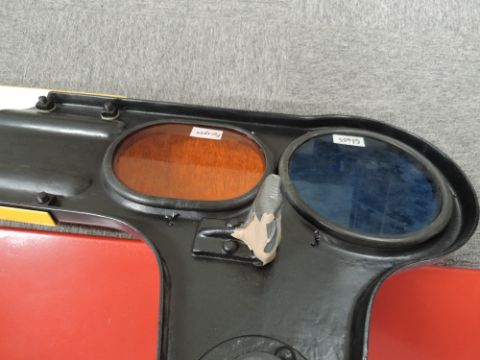 BR Distance Signal Arm in yellow and black with blue glass and orange Perspex lenses, having been restored, length 165cm