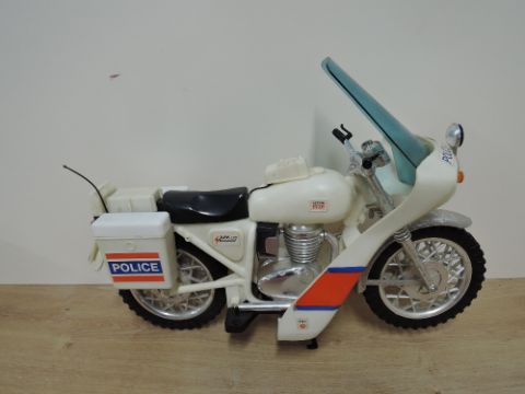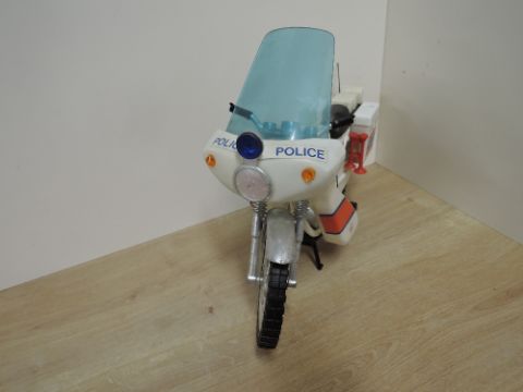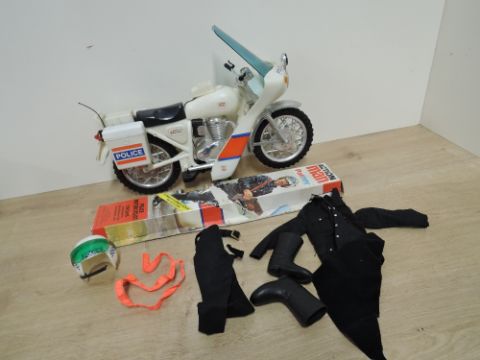 Palitoy Action Man Police Motorcycle with Police Motorcyclist Uniform in card box to make a storage locker, uniform consists of helmet, boots, jacket, shoulder strap