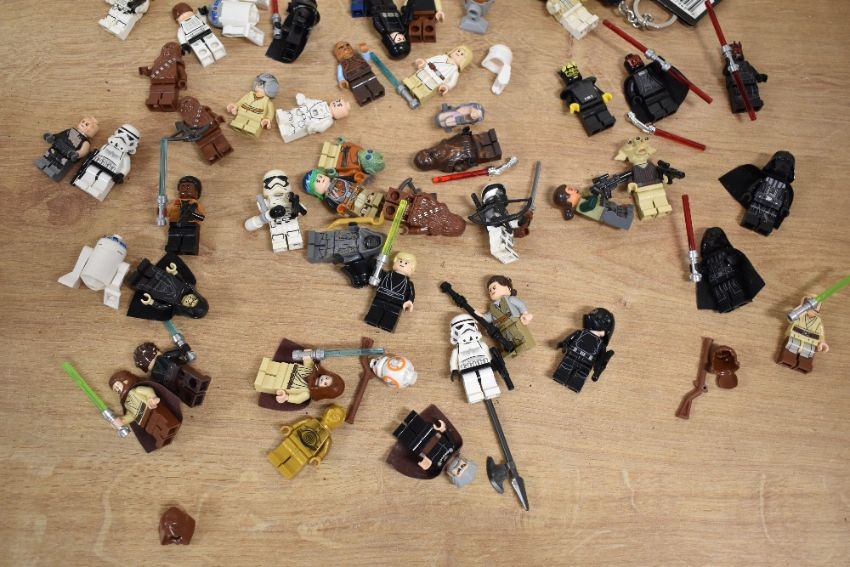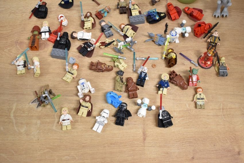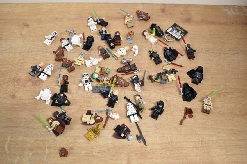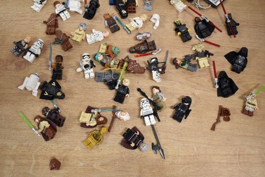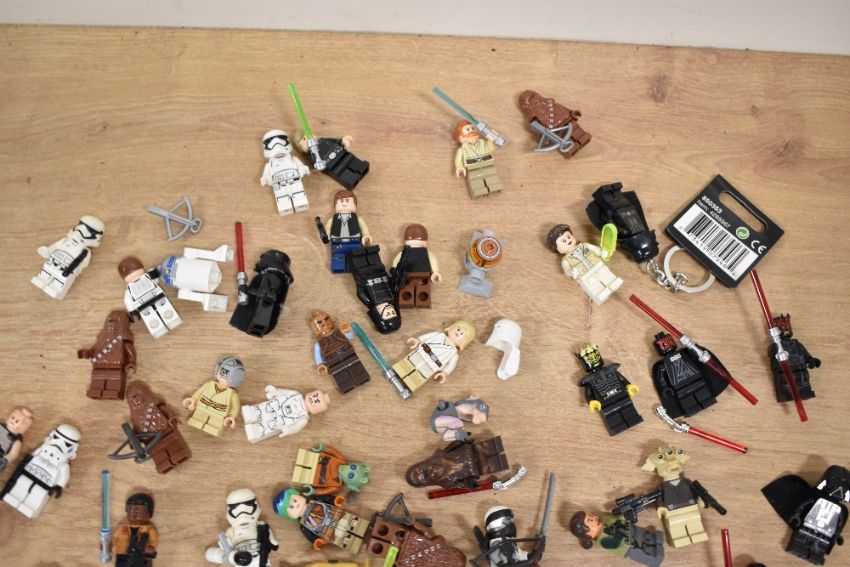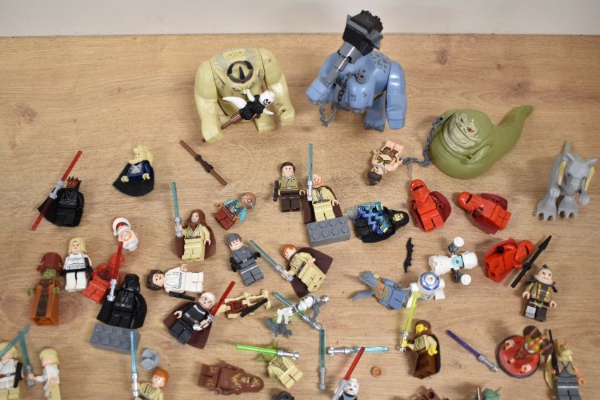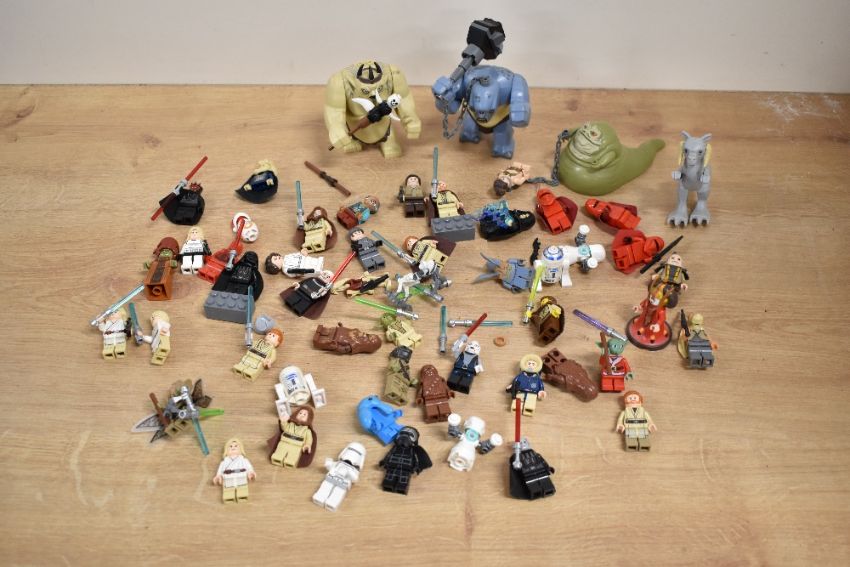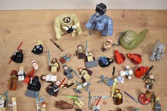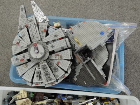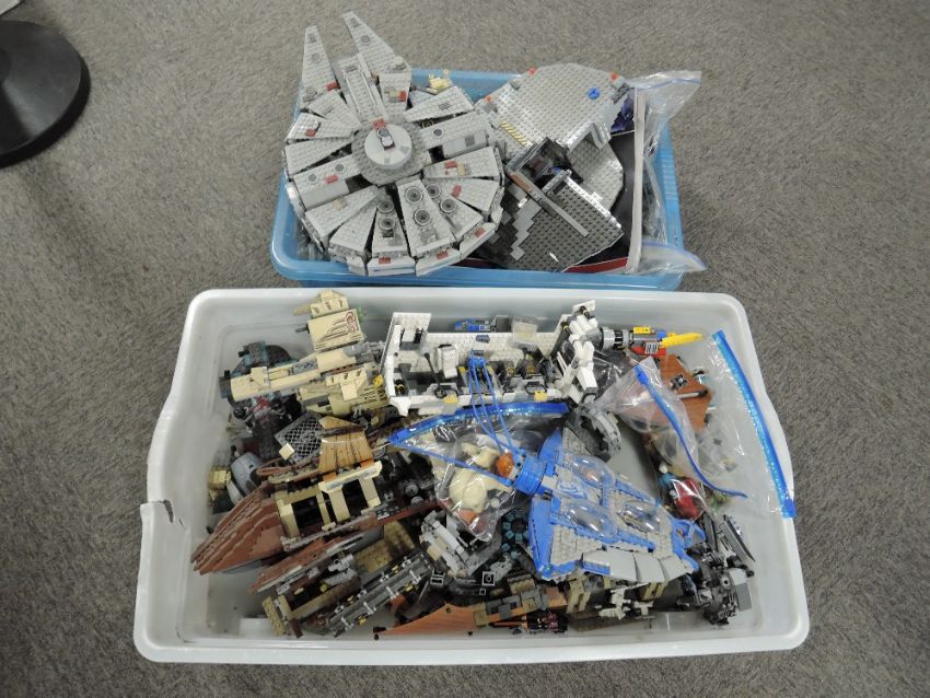 Loose Lego, Star Wars part built models including Hoth Echo Base, Wookie Gunship, Jabba's Sail Barge, Gungan Sub, Millennium Falcoln, with instruction booklets etc, many figures included, in two plastic boxes