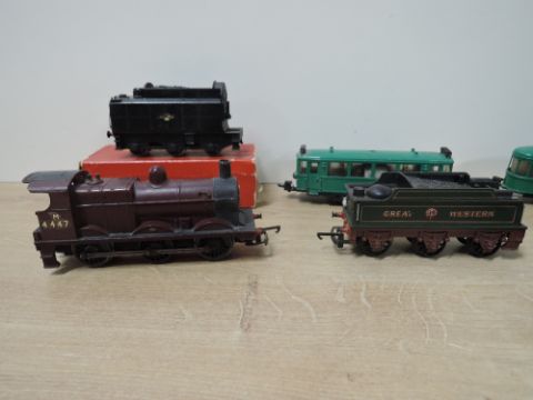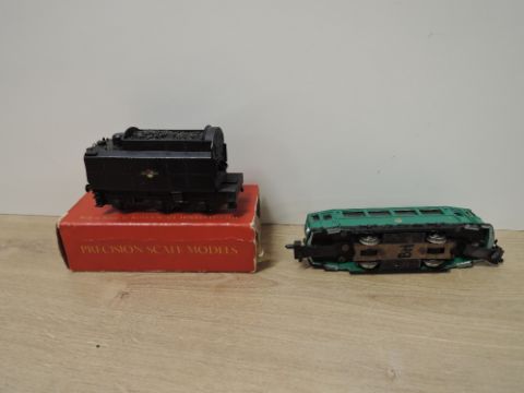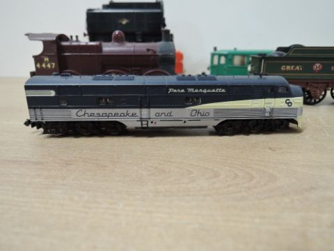 Mixed Scale Engines and Rolling Stock, N Gauge Life Like Chesapeake and Ohio Locomotive, Bachmann Union Pacific 6941 Locomotive, Tri-ang Bogi Bolster Trailer, 00 Gauge Triang 0-6-0 Loco, Great Western and BR Tenders, Hamo Germany BR Motor Coaches x 2 and a spare body and box (8)