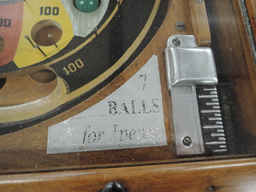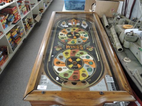 Refurbished Rock-Ola Wings Table Top Pin-Ball Machine, Made in USA, A Game of Skill, 7 Balls for 1 Pence, in fully working order with all balls and keys present, One Penny Coins also present, length 91cm, width 43cm, paper label inside numbered 7528