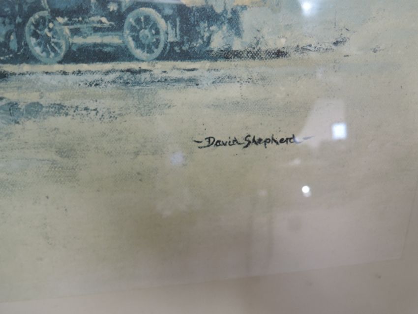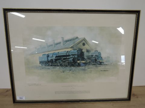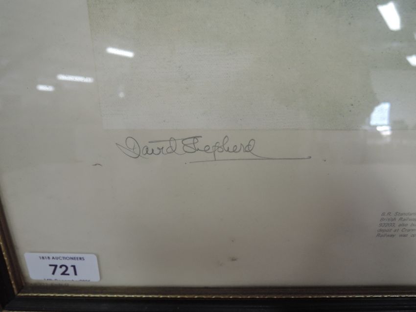 Print after David Shepherd, The East Somerset Railway, Black Prince and the Green Knights on Shed, Cranmore, 24cm x 40cm, bearing signatures, framed and glazed 40cm x 54cm