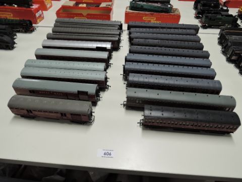 Hornby Dublo, Hornby, Mainline and similar LMS and BR Burgundy Carriages and Royal Mail Vans, 20 in total, very little use