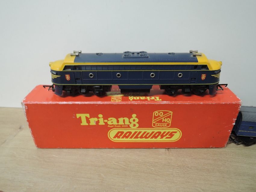 Tri-ang Railways 00 Gauge, Transcontinental Locomotives in blue and yellow x2, Obeservation Coach 9119, Baggage Car , Mail Express Car, Diner x2 and Coach 70831, all very little use (8), one box present for one Loco