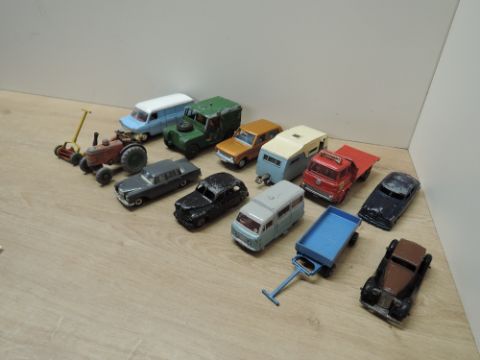 Dinky Playworn Die-casts, including 192 Range Rover, 168 Four Berth Caravan, 186 Mercedes Benz 220SE, Standard Atlas, 407 Ford Transit Van, Bedford Truck, Tractor & Trailer, Lawn Mower, Saloon Cars x3 and repainted Land Rover (13)