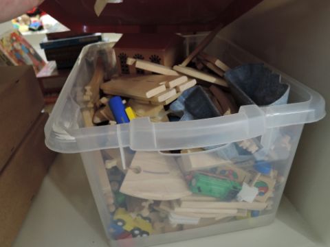 Modern Wooden Train Track and Accessories along with ERTL Trains, 1 box