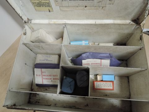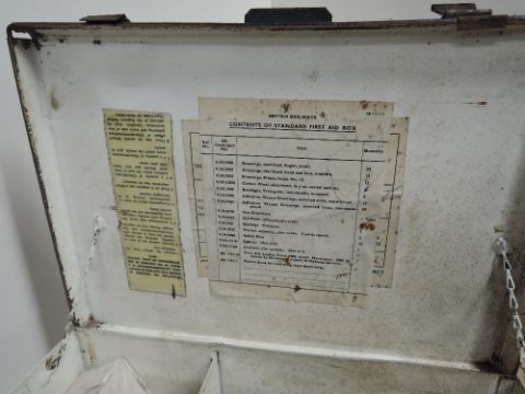 BR (M) Metal First Aid Box, The St Johns Ambulance Association 25cm x 35cm, height 13cm, part filled with contents label present