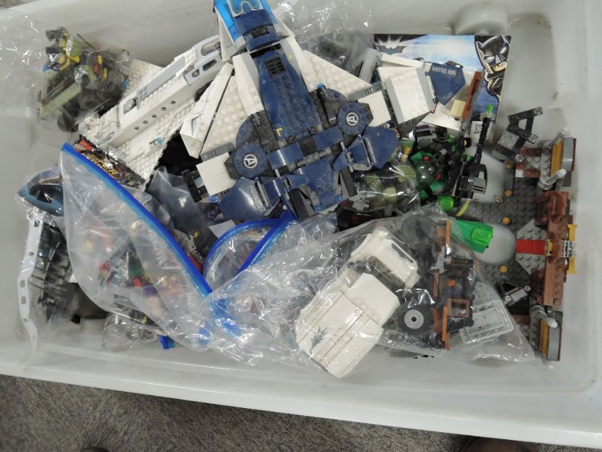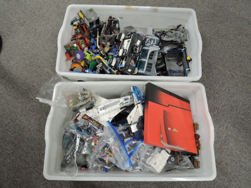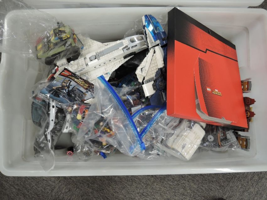 Loose Lego, Marvel inc Avengers part built models including Stark Jet, Quinjet, Captain America Vs Hydra, Avengers Towers, Super Heroes, Secret Police Dropship, Fantastic Beasts etc, many figures included in two plastic boxes