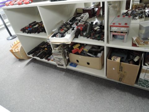 Playworn 00 Gauge, Loco & Tenders, Locomotives, Rolling Stock, Buildings, Accessories, Part Sets, Power Units etc, many being ex layout buildings and accessories, many damaged, spares and repairs, over 6 shelves, many makers seen