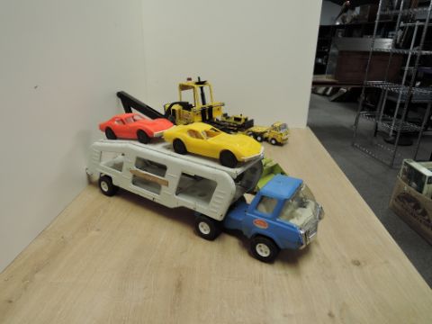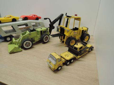 Tonka Pressed Steel Vehicles, Car Transporter with two plastic cars, Trencher, Fork Lift, Low Loader with Caterpillar Dozer