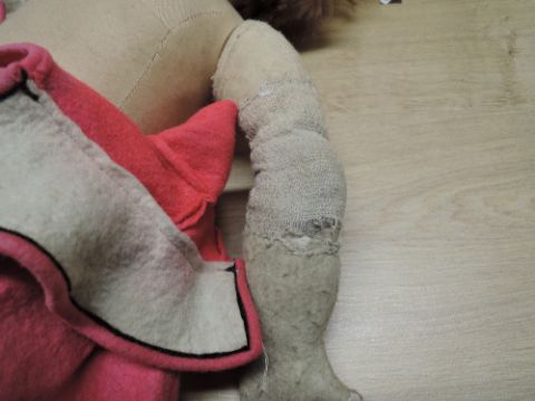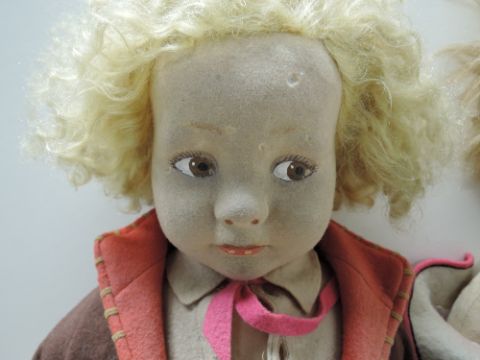 Vintage Dolls, Lenci style Felt and Cloth having stitched bodies, side glancing brown painted eyes and features, red painted lips, blonde and light brown hair, both fully clothed, no labels seen, height both 52cm