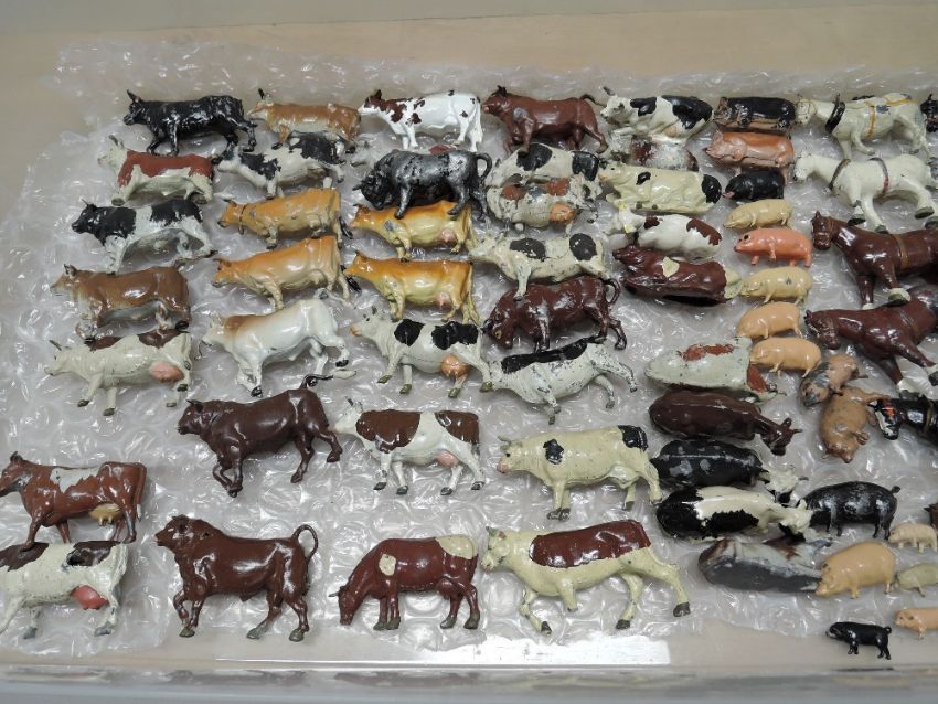 Britains and similar Lead Farm Animals and Figures, Cows, Horses, Pigs, Sheep, Chickens, Turkeys, Figures x6, 108 items in total, all appear complete, paint loss seen