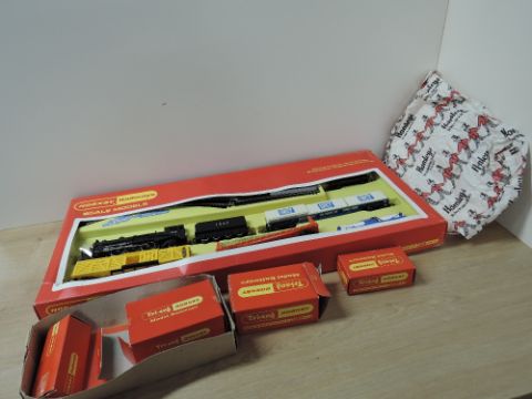Hornby and Tri-ang Hornby 00 Gauge, Hornby RS102 Express Freighter Set comprising, 2-6-2 American Loco & Tender 1542, Rolling Stock x5, Track, in original box missing cellophane, R043 Home Signal boxed, Tri-ang Hornby R145 Dundee Signal Box, R11 BR Ventilated Van, Level Crossing with gates, with boxes