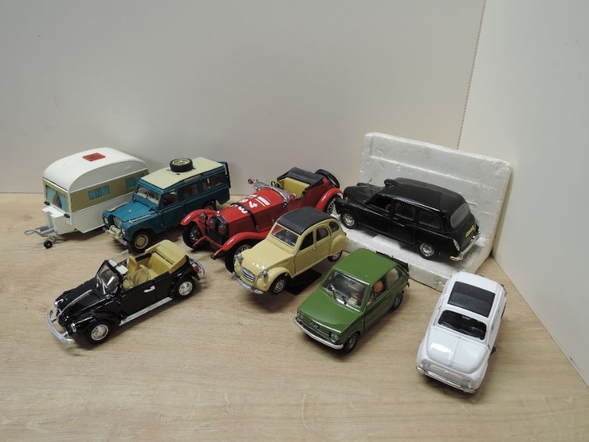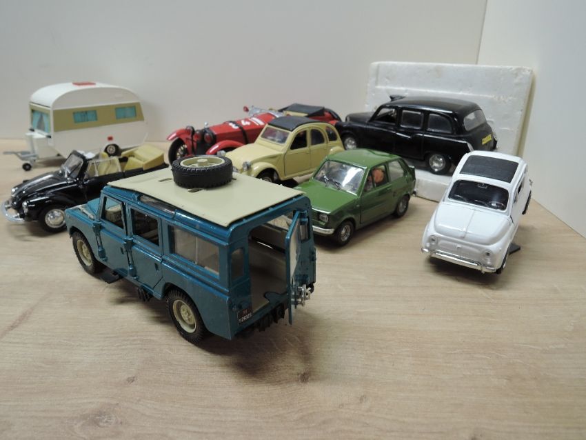 Polistil mixed Die-casts,1:16 scale Alfa Romeo Alfetta 1750, smaller scale Volkswagen 1303 Cabriolet, Fiat 500L, Fiat 126, Citreon 2CV, London Taxi, LWB Land Rover along with a Barlux Italy Caravan (8)