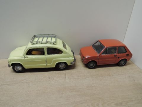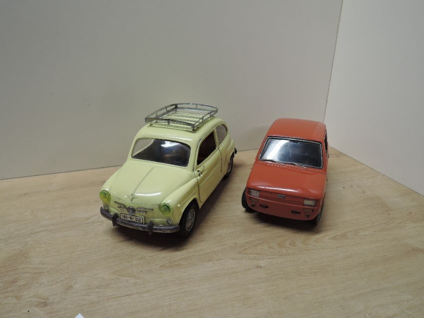 Plastic Battery operated and Friction Driven Scale Models, Pocher Torino Italy Fiat 126 in dark orange, TOK7 31634, missing one back indicator and light set, otherwise appears complete, Sanchis Spain Fiat 600 in light yellow, appears complete (2)
