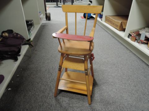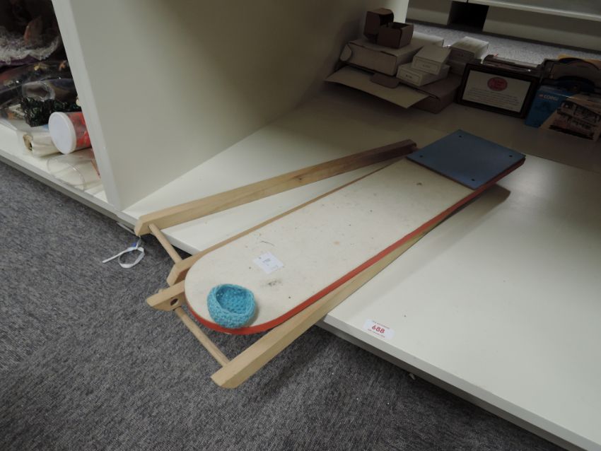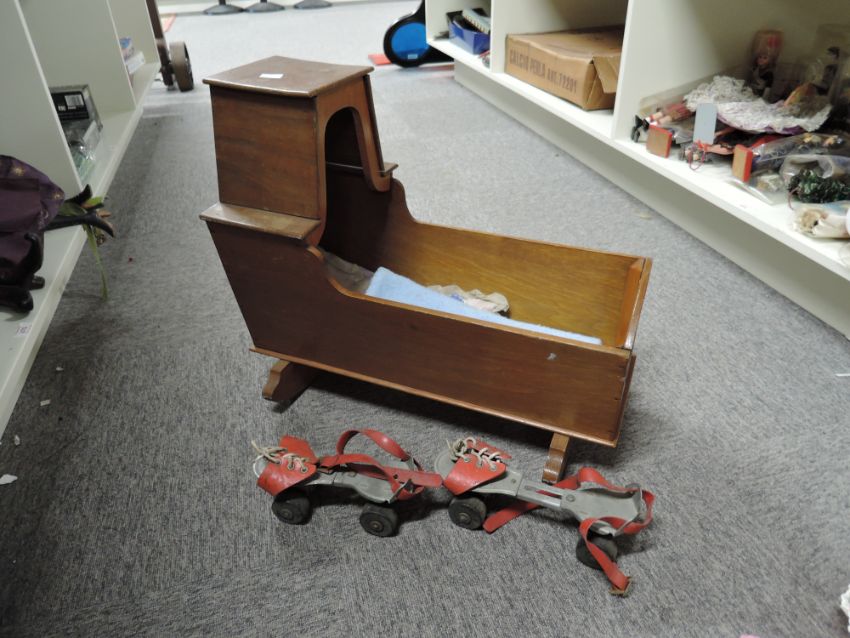 Mixed Childrens Toys, Wooden Crib, High Chair, Ironing Board, Pair of Roller Skates, Dolls etc