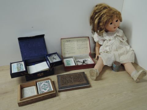 Vintage Doll and Games, mid 20th century Kim Toys composition having sleep brown eyes, open mouth with four teeth showing, jointed body with dress, socks and shoes, head stamped F.P, Tut-Tut or A Run In A Motor Car Game, 68x The Nile Fortune Playing Cards published in 1904 by the United States Playing Card Company, Bridge Set including two decks of cards and scoring pads and pencils in folding case