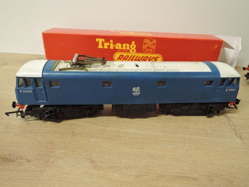 Tri-ang Railways 00 Gauge, R351 Co-Co Class EM2 Electric Locomotives, Electra 27000 in BR Green and in BR Blue, both complete, front wheel section on the green loco loose, R753 Electric Locomotive E3001, (3), one reproduction box included