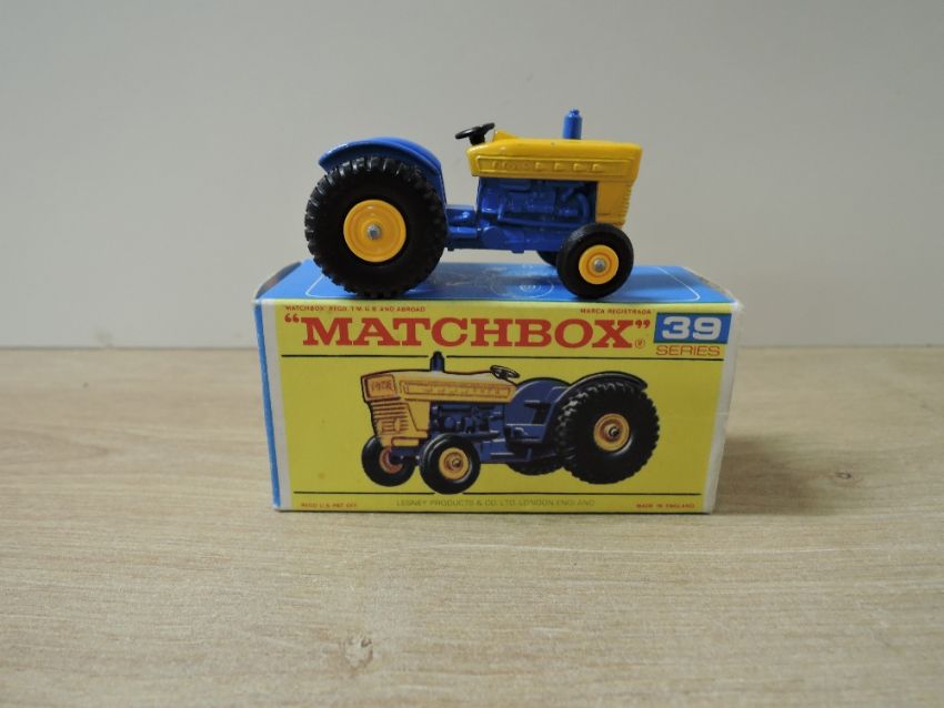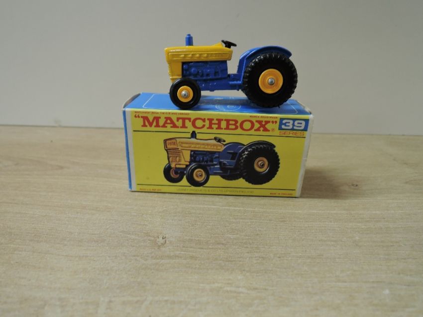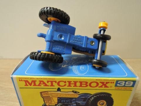 Matchbox Die-cast, 39 Ford Tractor, yellow bonnet and hubs, blue body, black tyres, very little wear, tyres loose, box complete and in good condition, 1969 Type F box