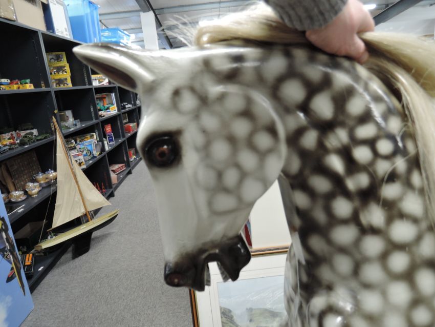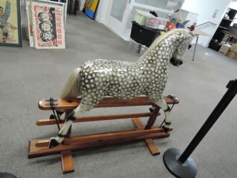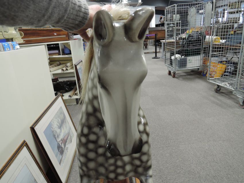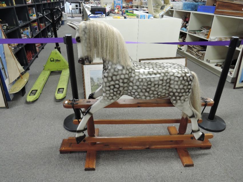 Greenwood Tarporley Dapple Grey Wooden Rocking Horse having real horse hair mane and tail, saddle and stirrups present but not attached to horse, on metal and wood traditional swing action base, length 150cm, height 120cm, age related cracking seen, ears appear to be complete