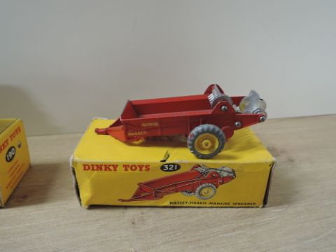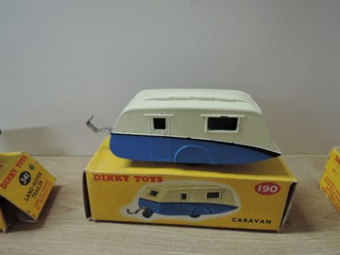 Dinky Die-casts, 190 Caravan in blue and white, 321 Massey Harris Manure Spreader, 341 Land Rover Trailer in green, all with very little wear, all in complete boxes (3)