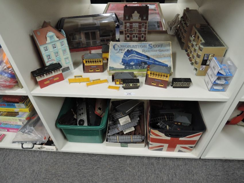 Tri-ang, Peco and similar 00 gauge Track along with Accessories including Bachmann Art Deco Station Building boxed, Tri-ang Signal Boxes etc on two shelves along with a 1937 Coronation Scot Railway Game Touring Great Britain, appears complete in worn box