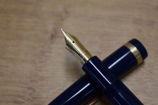 A Parker Duofold Maxima aerometric fill fountain pen in Blue with broad decorative cap band having 14K Parker England 50 nib. Circa 1956. Later box