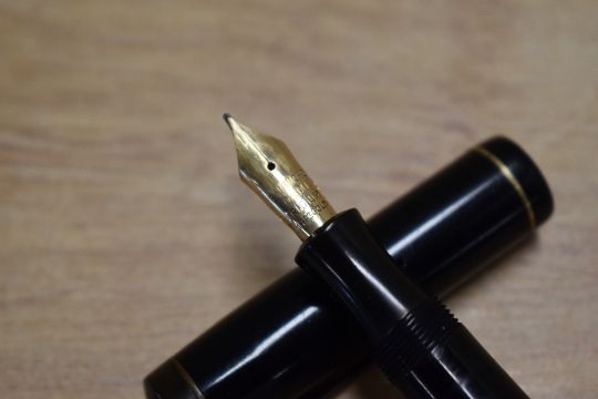 A Mentmore Diploma button fill fountain pen in Black with single narrow cap band having Mentmore Osmi Iridium 14CT Gold nib. Circa 1950. Scratch to the barrel.