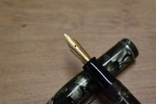 A Conway Stewart 75 lever fill fountain pen in Green and Black Marble with a single cap band having Conway Stewart 14CT Gold nib. Circa 1950